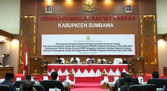 Sumbawa Besar, mediasumbawa.com – Bupati Sumbawa, Ir. H. Syarafuddin Jarot, M.P., menyampaikan penjelasan terhadap Rancangan Peraturan Daerah (Ranperda) tentang Rencana Pembangunan Jangka Menengah Daerah (RPJMD) Kabupaten Sumbawa Tahun 2025–2029 dalam sidang paripurna DPRD Kabupaten Sumbawa yang digelar Senin (16 Juni 2025) pagi. Sidang dipimpin langsung oleh Ketua DPRD Kabupaten Sumbawa, Nanang Nasiruddin.
