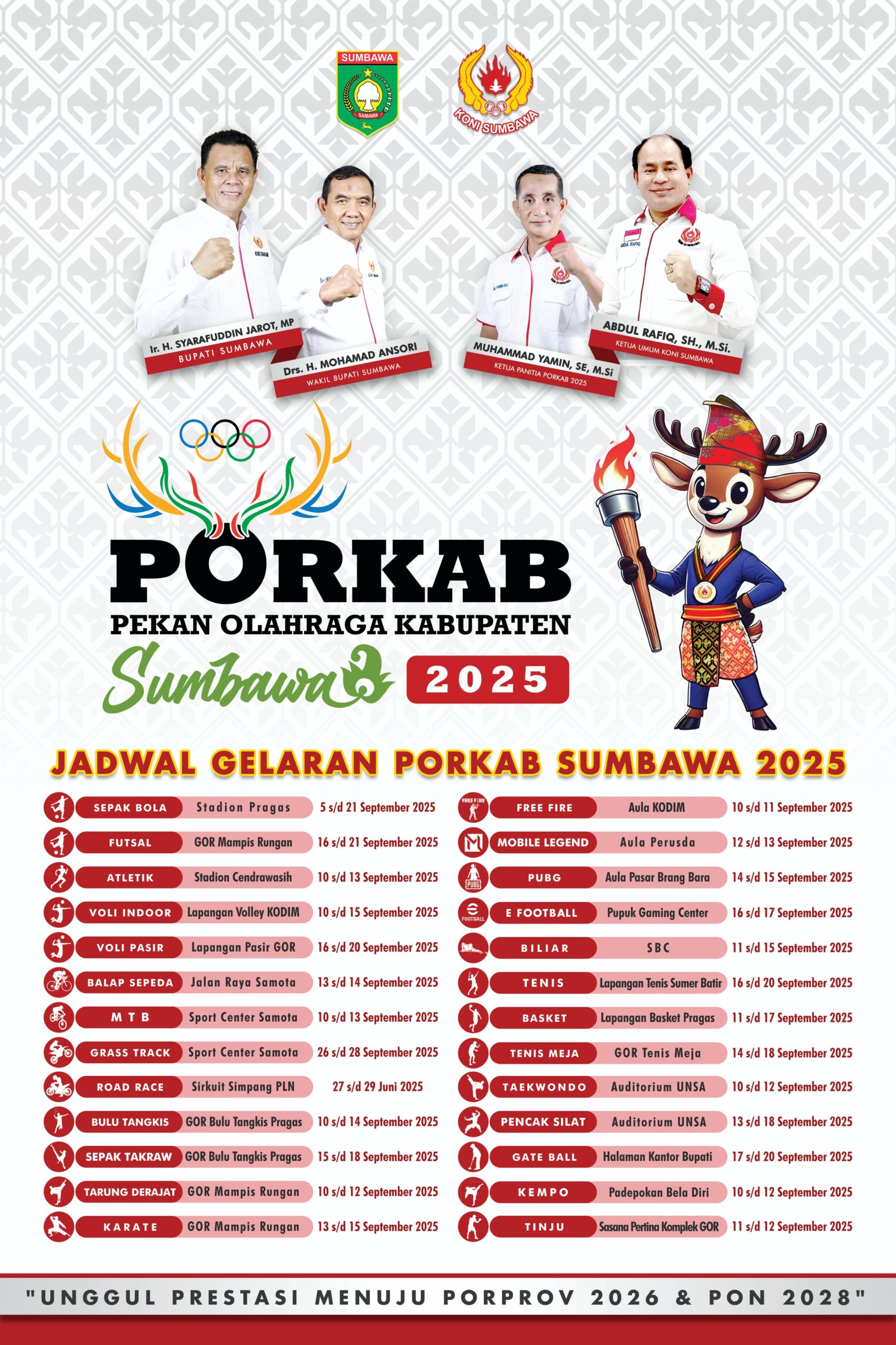SUMBAWA, mediasumbawa.com– Pendaftaran peserta Pekan Olahraga Kabupaten (Porkab) Sumbawa mulai dibuka selama 12 hari ,sejak 7 hingga 18 Agustus 2025. Dalam Porkab Sumbawa tahun ini, ada 33 cabang olahraga (Cabor) yang diperlombakan.