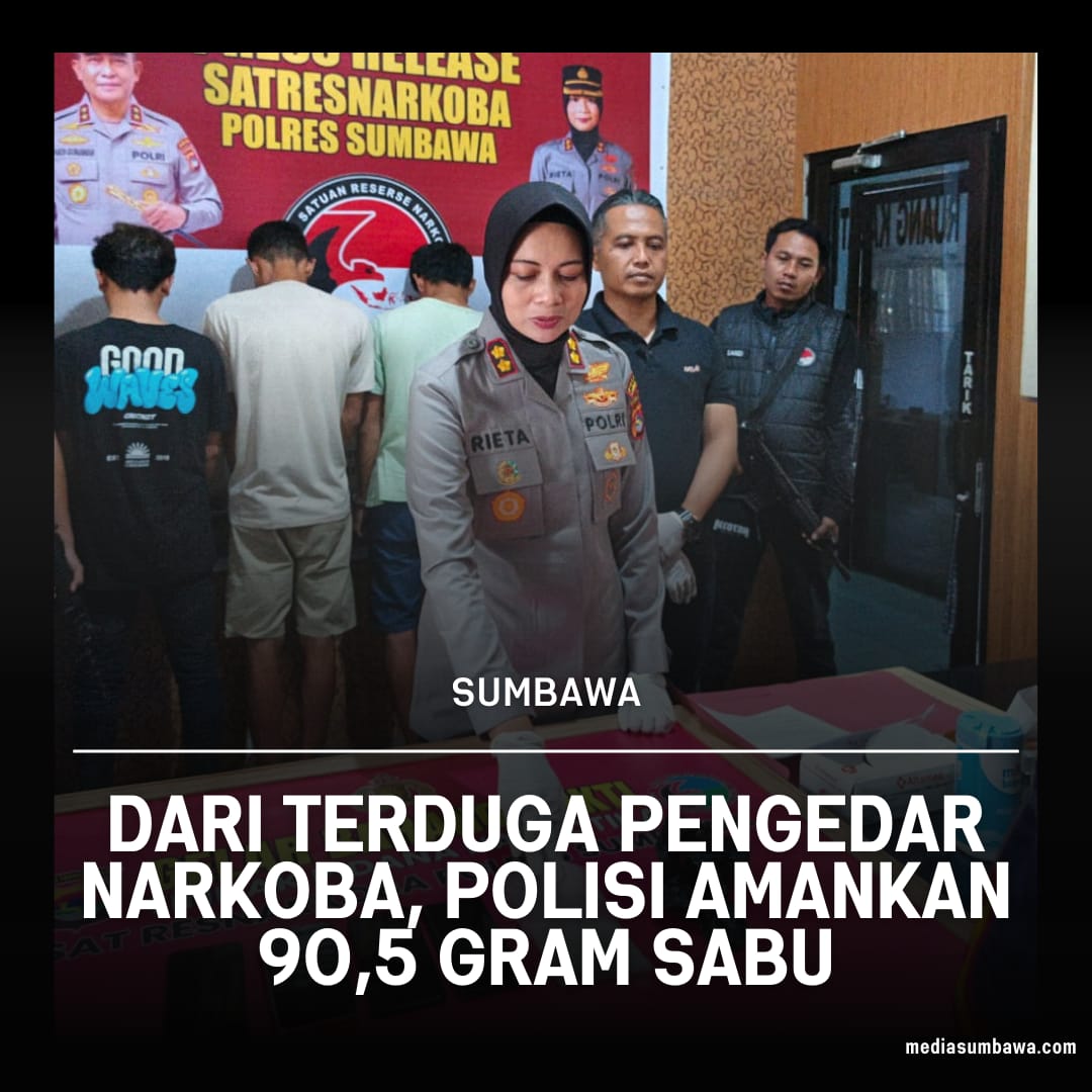 Sumbawa Besar, mediasumbawa.com- Satuan Reserse Narkoba (Satresnarkoba) Polres Sumbawa berhasil membongkar jaringan peredaran narkotika jenis sabu di wilayah Kecamatan Rhee. Dalam operasi yang dilakukan pada Jumat, 15 Agustus 2025, polisi mengamankan empat orang terduga pelaku dengan barang bukti 90,5 gram sabu.