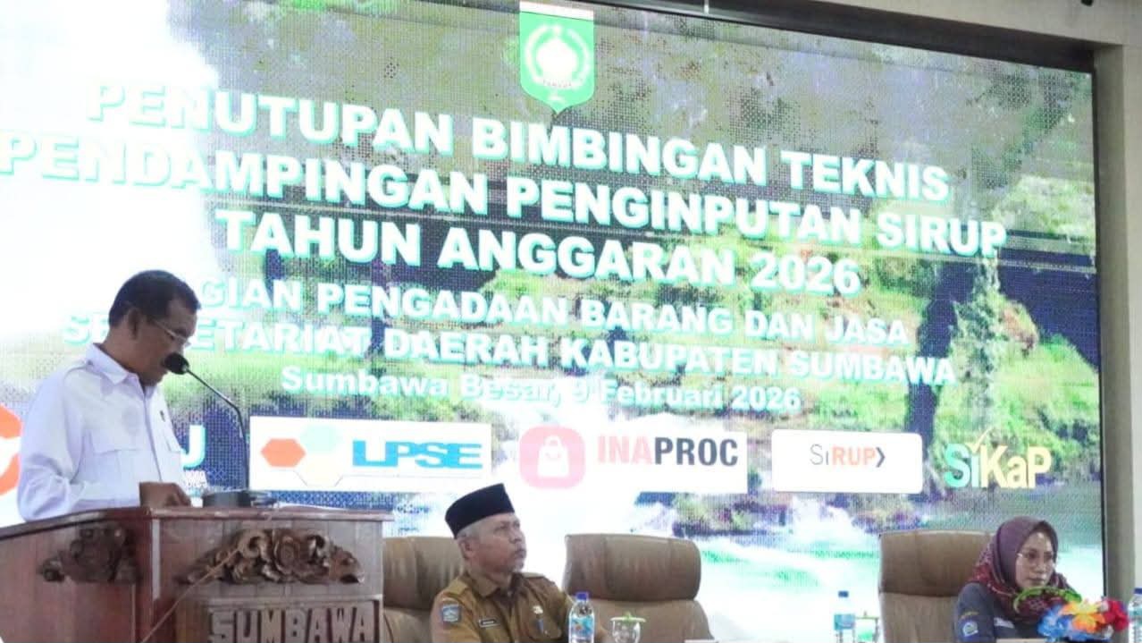 Sumbawa, mediasumbawa.com- Wakil Bupati Sumbawa, Drs. H. Mohamad Ansori, secara resmi menutup kegiatan Bimbingan Teknis (Bimtek) Pendampingan Penginputan Sistem Informasi Rencana Umum Pengadaan (SiRUP) Tahun Anggaran 2026. Kegiatan tersebut berlangsung di Aula H. Madilaoe ADT Lantai III Kantor Bupati Sumbawa, Senin (09/02/2026).